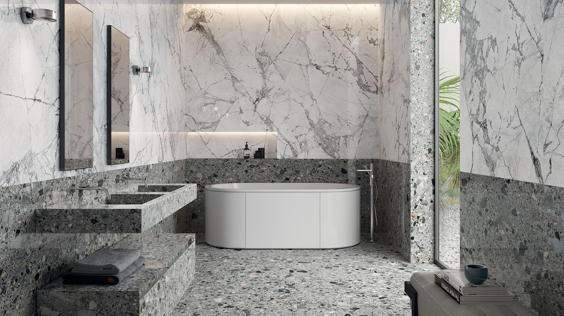 Wandhängende und freistehende Waschtische, Duschbecken und dazu passende Konsolen: Die originellen Einrichtungen und Ergänzungsgegenstände für Badezimmer von Italgraniti sind mit den nur 6 mm dicken Platten Mega verkleidet, die für eine perfekt monolithische Wirkung sorgen. ItalgranitiLIVE ist unser Badausstattungsprojekt, das dank der extraordinären technischen und ästhetischen Eigenschaften des dünnen Feinsteinzeugs Design mit Funktionsfähigkeit verbindet und stilistisch einwandfrei koordinierte Badezimmer gestaltet.