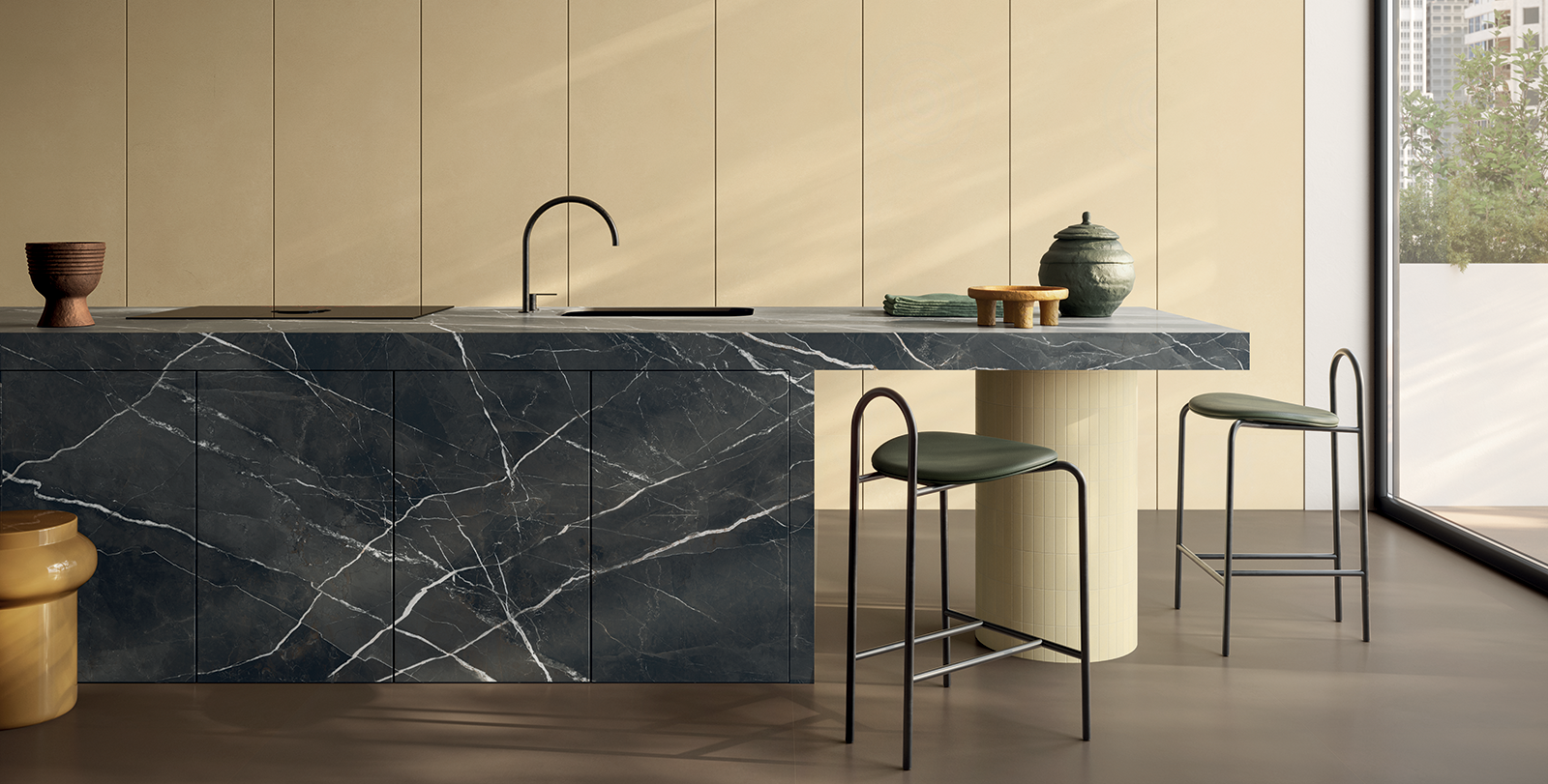 Scopri la versatilità del gres porcellanato Italstone: una vasta gamma di lastre per arredare tutte le superfici della cucina, dai piani lavoro ai mobili giorno, fino ai complementi d’arredo.