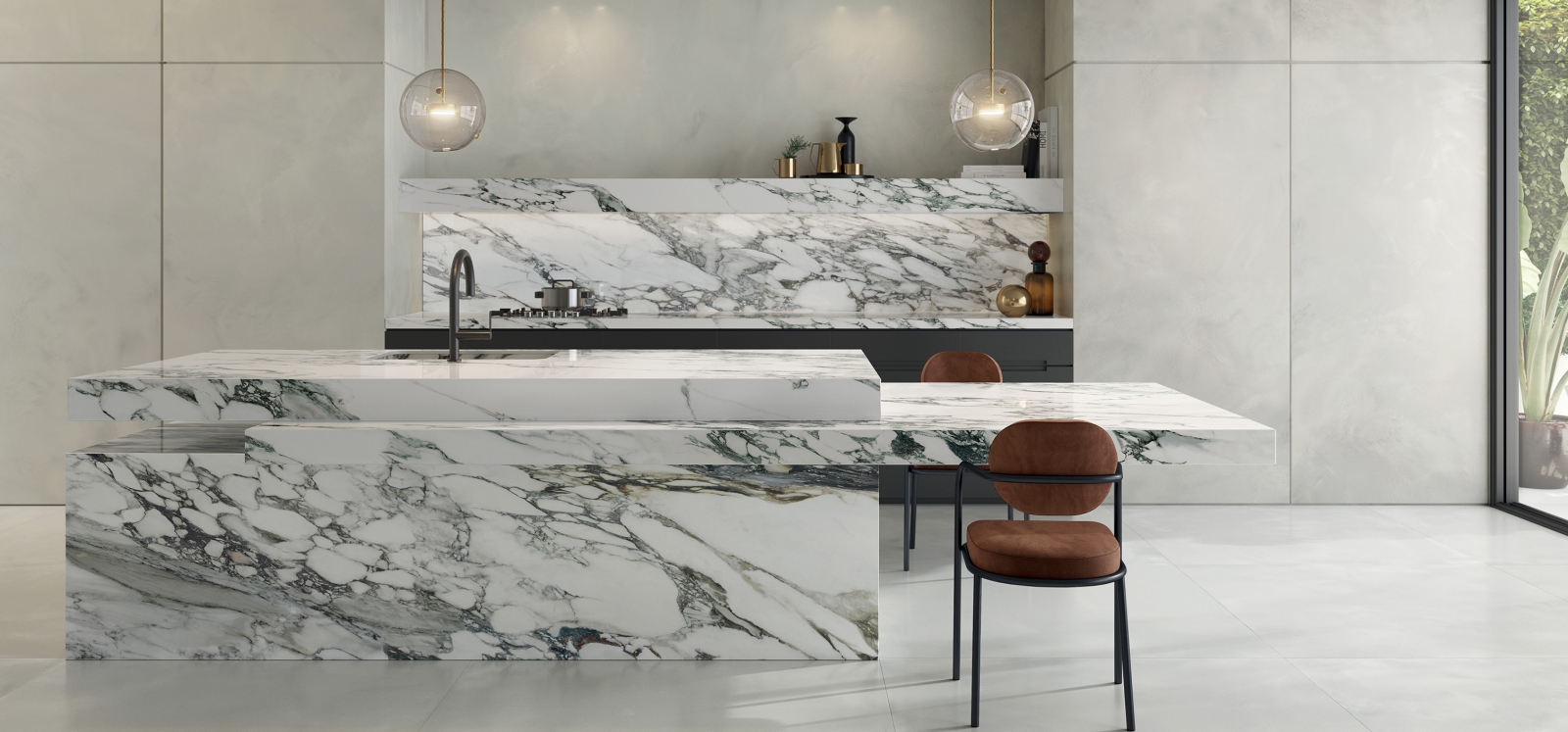 Calacatta Macchia Vecchia ist eine Platte aus Feinsteinzeug, inspiriert von einem kostbaren Marmor aus Carrara, zeitgenössisch und klassisch zugleich. Gekennzeichnet durch einen weißen Untergrund mit starker Maserung, teilweise sehr dick mit verschiedenen Schattierungen von Hellgrau über Dunkelgrau bis hin zu Beigetönen.
