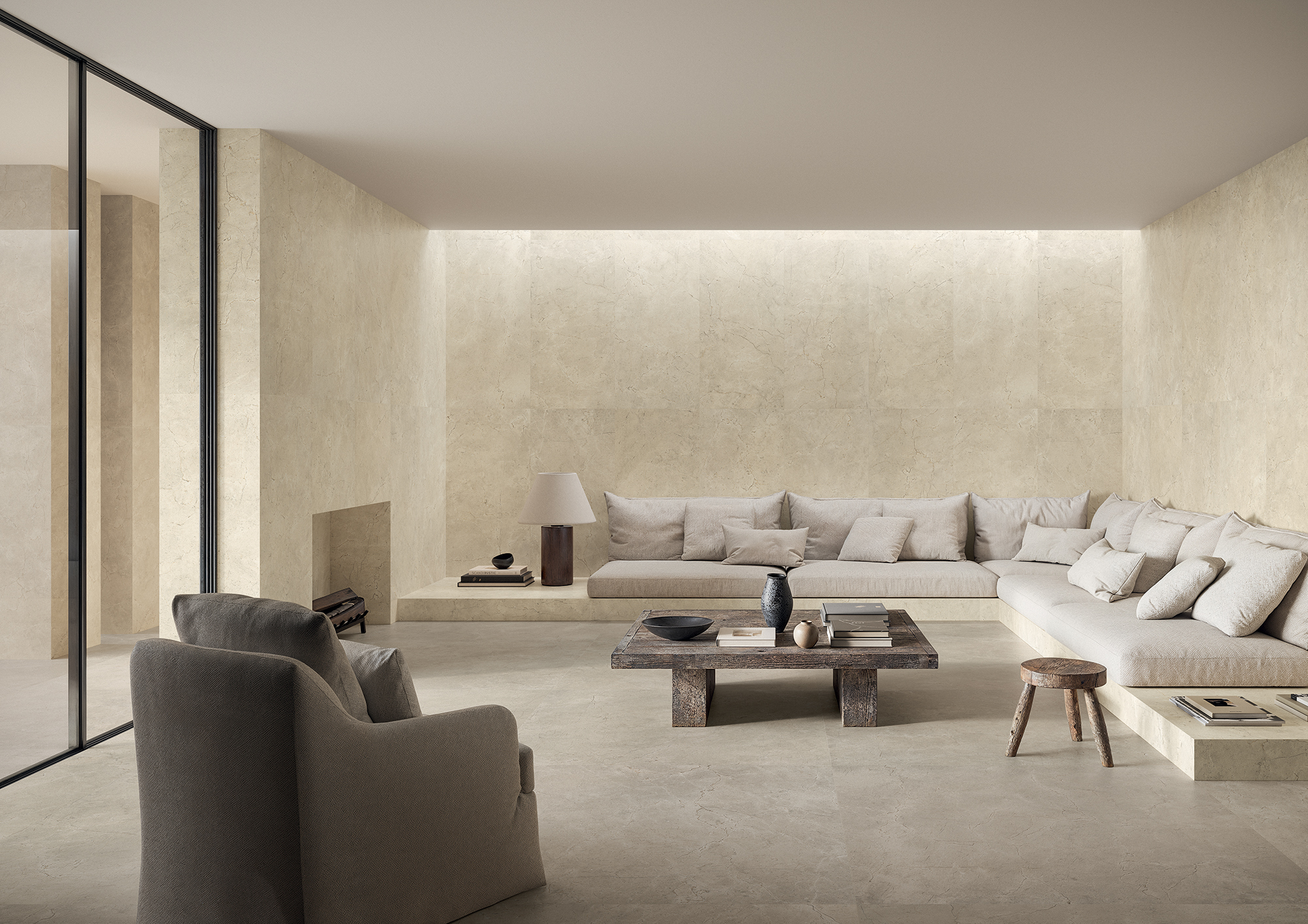 Italgraniti vereint den ursprünglichen Charakter von zwei Natursteinen in einer einzigartigen Kollektion. Kalkstein, ein sedimentäres Kalkgestein mit weichen Tönen und zarten Äderungen, und Marfil-Marmor, der aus den Steinbrüchen von Alicante in Spanien stammt und in der Innenarchitektur wegen seiner schlichten Eleganz sehr geschätzt wird