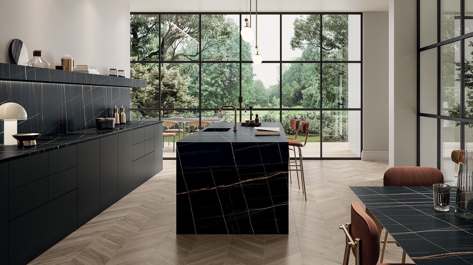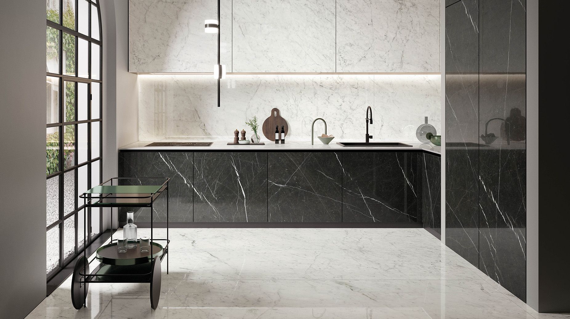 Küchenplatten und Arbeitsplatten sind Einrichtungselemente, die weit über ihre Funktion hinausgehen und auch eine ästhetische Rolle spielen. Sie charakterisieren einen der meistfrequentierten Räume der Wohnung und müssen Schönheit mit Vielseitigkeit und Bequemlichkeit unter einen Hut bringen: Bedürfnisse, die heute leicht zu erfüllen sind, dank der großformatigen Platten aus Feinsteinzeug von Italgraniti Group. Das extragroße Format verleiht den Arbeitsplatten (einschließlich Waschtische) eine Ausdehnung wie nie zuvor. Die innere technische Güte der Keramik ist von den verfügbaren Dicken (12 mm oder 6 mm) unabhängig, die dagegen die höchste Anwendungsfreiheit garantieren.