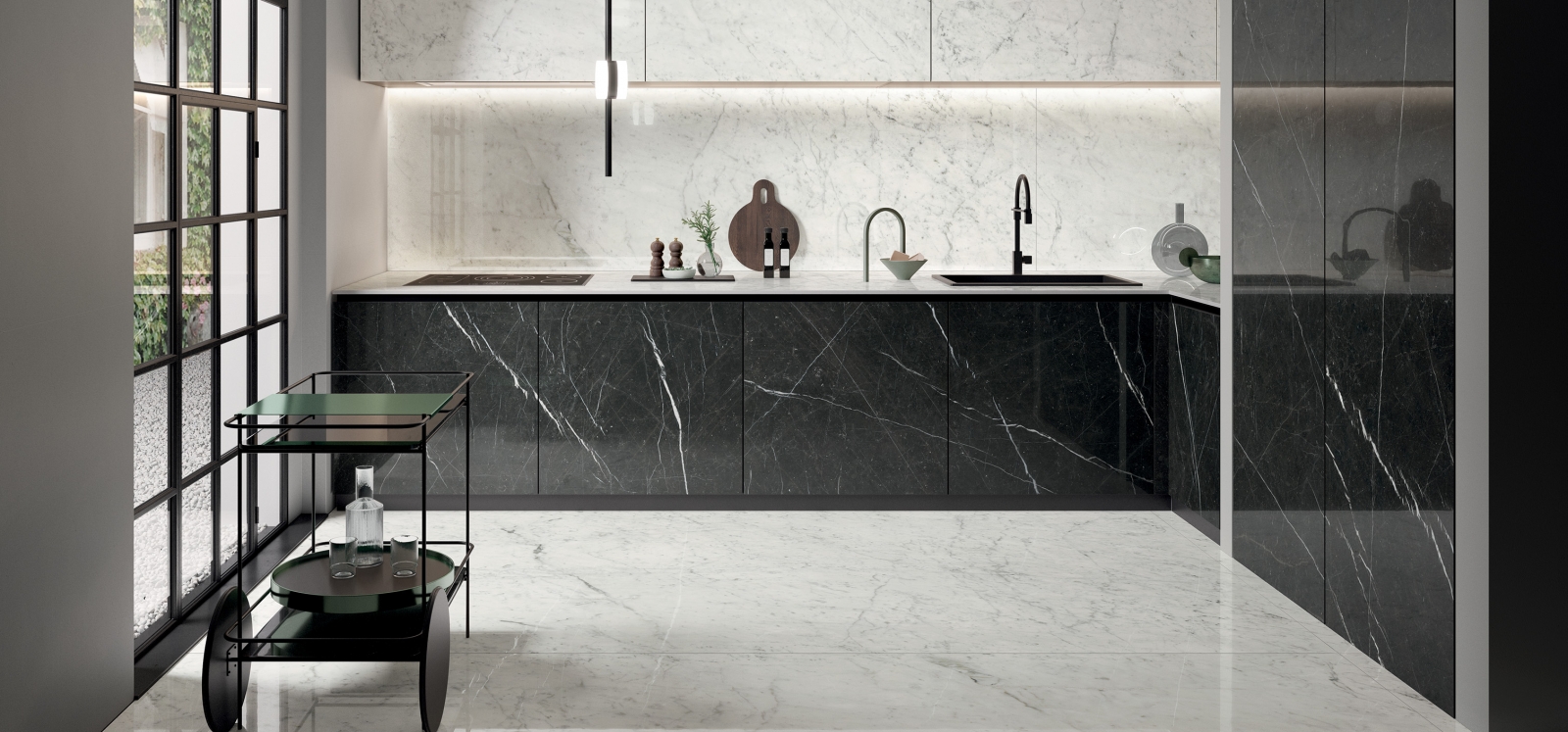 Entdecken Sie die Vielseitigkeit des Feinsteinzeugs von Italstone: eine große Auswahl an aufeinander abgestimmten Platten in 1,2 und 0,6 cm Dicke, um alle Oberflächen in der Küche einzurichten, von Arbeitsplatten über Wohnzimmermöbel bis hin zu Einrichtungsaccessoires.